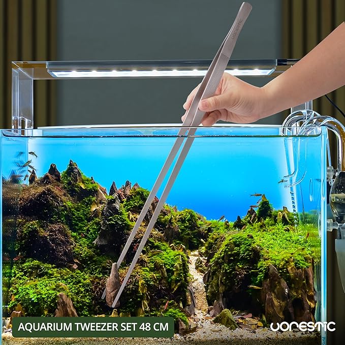 - Keep your Scape Green and Healthy - your plants and pet fish will thank you for it! This set comes with two 18.9 inches extra long tweezers, curved and straight, essential for adding aquarium plants, moving terrarium decor, and feeding fish, reptiles, and insects