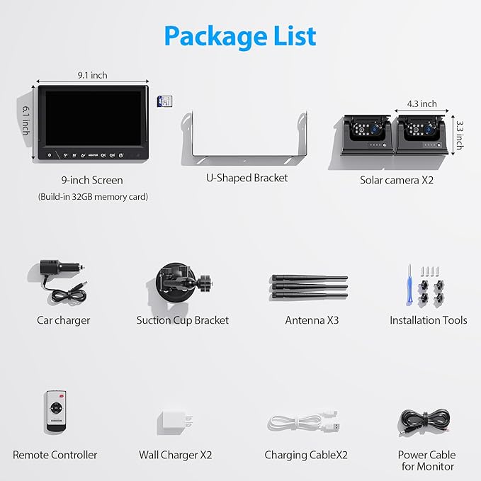 - Low Power Consumption Camera: This solar backup camera adopts new upgraded technology with low function consumption and long working time. You can turn on/off the monitor and camera with the included remote control. No need to remove the magnetic wireless backup camera system to manually turn it on or off, more convenient and no need for frequent charging!