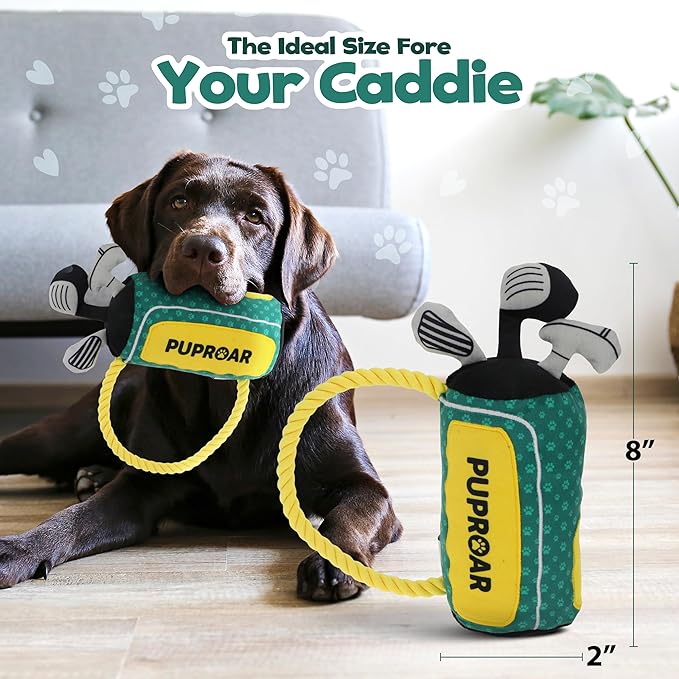 - FUNNY DOG TOY FOR GOLF-LOVING PUPS: shaped like a plush golf club bag, this toy delivers laughs, squeaks, and sporty charm straight from the fairway.
