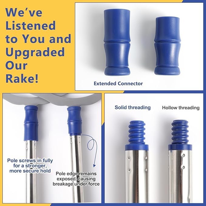 - 54" Ergonomic Handle with Thicker Poles: Designed with user comfort in mind, the 54” long handle and much thicker stainless steel poles of the pet hair broom allows for an upright position while raking, minimizing back strain and making it suitable for users of all heights.