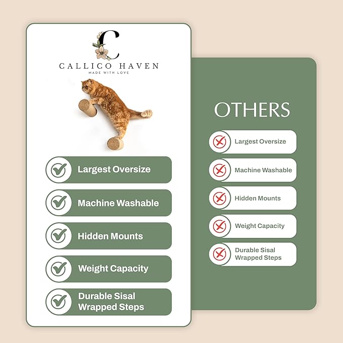 - HIDDEN MOUNTS and SISAL ROPE- Hidden mounts are a theme with our Callico Haven shelves to provide a sleek design aesthetic. The durable sisal rope also provides a safe space-efficient wall-mounted cat furniture step that supports your cat’s natural instinct to climb and scratch. This cat wall climber seamlessly blends into any home while providing endless entertainment for kittens and large cats alike.