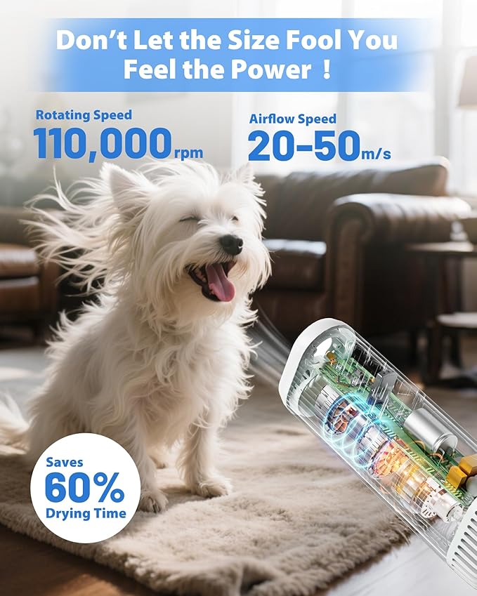 - Fast Drying with High-Velocity Airflow: This powerful pet hair dryer features a 950W brushless motor and high velocity airflow up to 50m/s, drying your pet 60% faster than traditional dryers. Perfect for after baths, rainy walks, or grooming sessions.