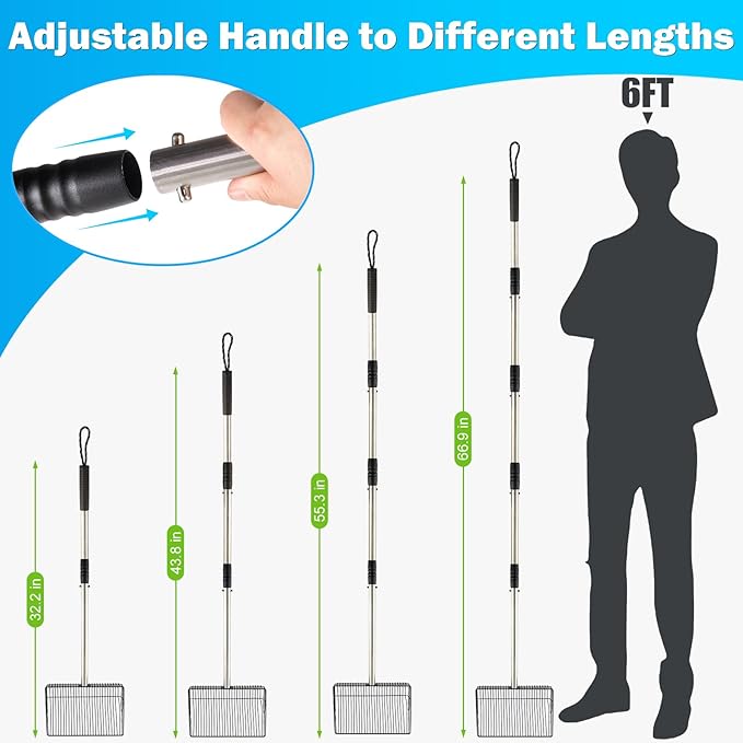 - 【 4 in 1 Detachable Design 】Use multifunctional Large Metal Chicken Poop Scooper to completely change your chicken coop cleaning program. Easily switch between four sizes -32.3 inches,43.8 inches, 55.3 inches, and 66.9 inches . Whether you are working in a spacious area or a confined space, this Chicken Coop Litter Scoop can simplify tasks without the need for multiple tools.