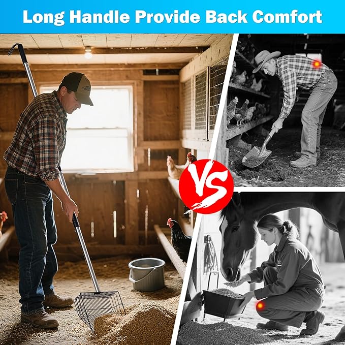 - 【Ergonomic Design】The Chicken Coop Scoop provides a comfortable and safe grip. The sifting chicken coop design perfectly fits your hand, providing maximum control and maneuverability, making your Chicken Poop Scooper cleaning experience easy.