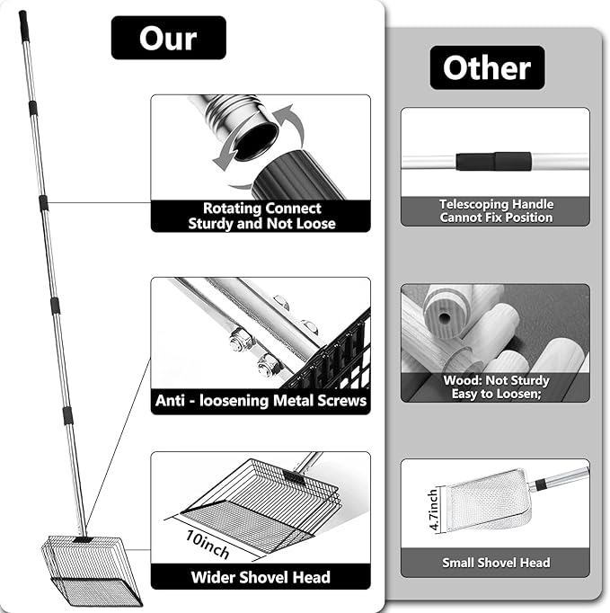 - π§ Multi-Purpose Sifter Shovel: More than just a chicken coop cleaner, this tool transforms easily into a cat litter scoop, sandbox shovel, cow stall cleaner, or beach sand scooper. Perfect for farmers, pet owners, and outdoor enthusiasts looking for a reliable, all-in-one cleaning tool