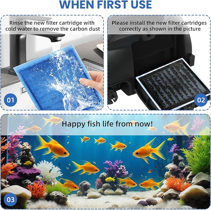 - Easy to install: First, turn off the aquarium power to avoid leakage, then remove the old filter, shake the new filter element to evenly distribute the carbon particles, and finally align it with the slot and insert the new filter element to complete the installation.