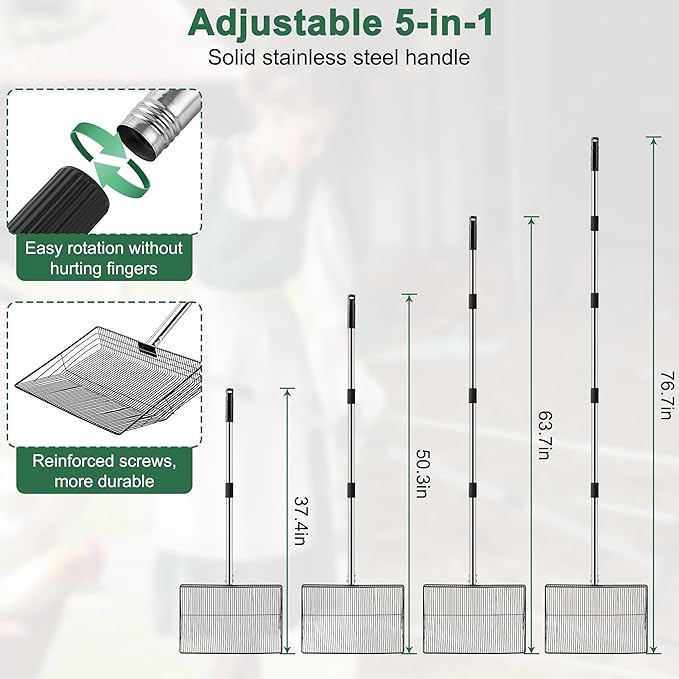 - π [5 in 1 Adjustable Handle] Our stainless steel chicken pooper scooper can be adjustable to 24", 38", 51", 64" and 77" by simple rotation, which is convenient for people of different heights/different scenarios to use. The longer handle makes it comfortable and effortless for you to use.