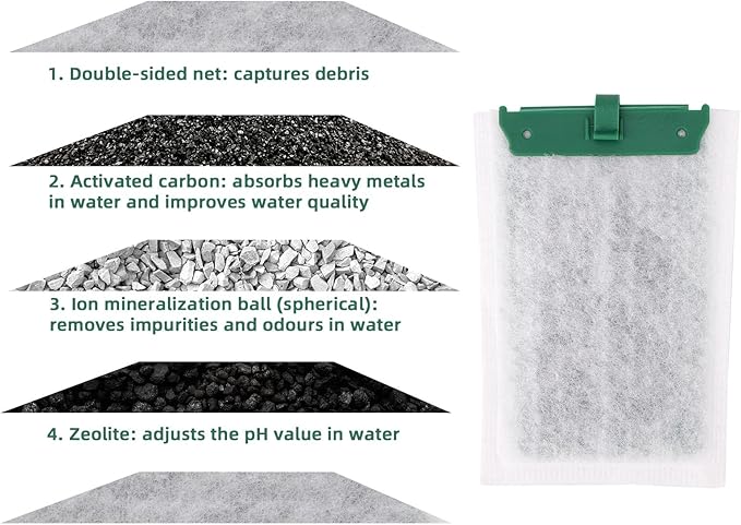 - 4-Stage Filtration System: The aquarium filter cartridge features dual-sided mesh to capture fish waste, uneaten food, and debris; activated carbon removes impurities for cleaner, clearer water; zeolite to control ammonia levels and stabilize pH, and ion mineralization ball for biological filtration, keeping your aquarium water clear and healthy for your fish.