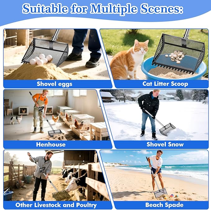 - Large-Capacity Metal Chicken Poop Scooper : Constructed with a heavy-duty metal shovel head and rake, paired with a 304 stainless steel handle and an adjustable soft rubber grip, it is suitable for use year-round. The metal-toothed chicken manure shovel head measures 12 inches in width, with a curved groove design significantly increasing the shovel's capacity, enabling it to scoop and sift waste in a single pass, greatly enhancing work efficiency.