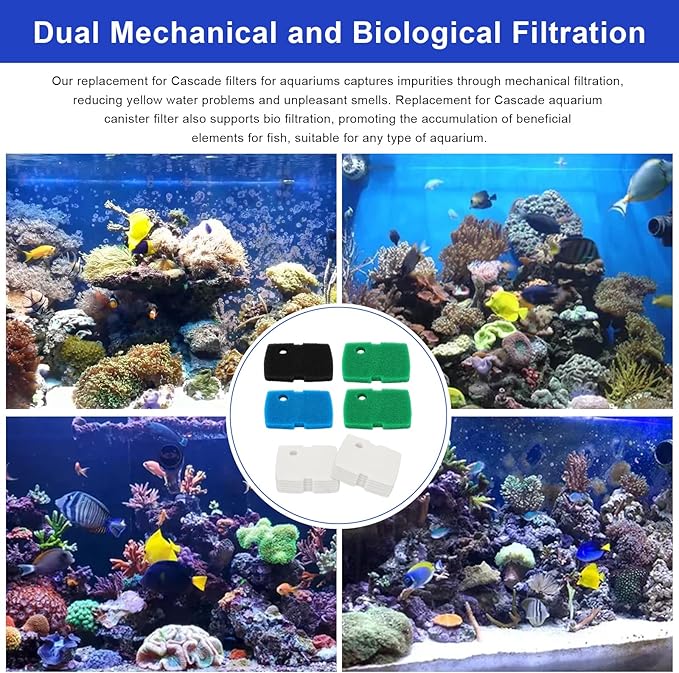 - 【Dual Mechanical and Biological Filtration】Our replacement for Cascade filters for aquariums captures impurities through mechanical filtration, reducing yellow water problems and unpleasant smells. Replacement for Cascade aquarium canister filter also supports bio filtration, promoting the accumulation of beneficial elements for fish, suitable for any type of aquarium.